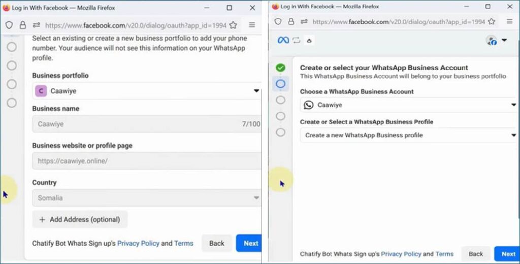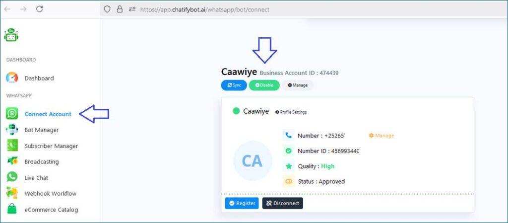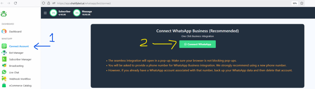 - Connect your WhatsApp business account on Chatify Bot: